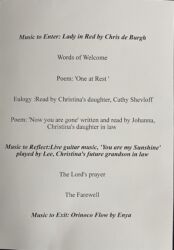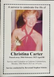 Christina’s funeral took place today, the 20th of March, at Carleton Crematorium (if you wish you can leave a comment at the bottom of the page). This is what her daughter Cathy posted on our Facebook page, 27thFebruary: